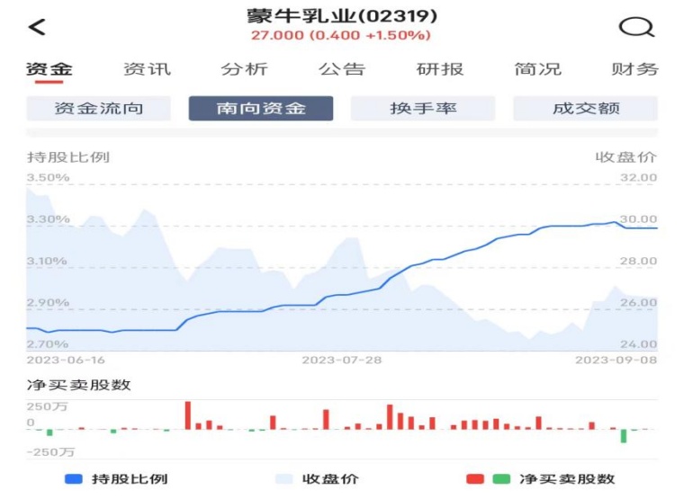 智通财经APP数据显示,截至9月7日的近60个交易日,蒙牛获得12.28亿港元资金净流入。南向资金自7月初以来持续增持蒙牛股票,其持股数量由7月5日的1.11亿股,增加至9月8日的1.3亿股,增幅达到17.1%,足见投资者对蒙牛中期业绩及长期发展前景的认可。