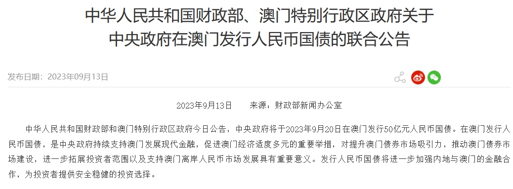 智通财经APP获悉,9月13日,财政部和澳门特别行政区政府发布联合公告。公告中称,中央政府将于2023年9月20日在澳门发行50亿元人民币国债。在澳门发行人民币国债,是中央政府持续支持澳门发展现代金融,促进澳门经济适度多元的重要举措,对提升澳门债券市场吸引力,推动澳门债券市场建设,进一步拓展投资者范围以及支持澳门离岸人民币市场发展具有重要意义。
