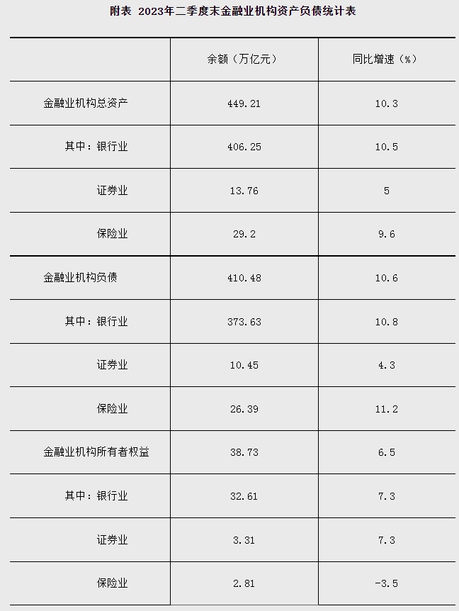 智通财经APP获悉,9月13日,央行发布的数据显示,初步统计,2023年二季度末,我国金融业机构总资产为449.21万亿元,同比增长10.3%,其中,银行业机构总资产为406.25万亿元,同比增长10.5%;证券业机构总资产为13.76万亿元,同比增长5%;保险业机构总资产为29.2万亿元,同比增长9.6%。金融业机构负债为410.48万亿元,同比增长10.6%,其中,银行业机构负债为373.63万亿元,同比增长10.8%;证券业机构负债为10.45万亿元,同比增长4.3%;保险业机构负债为26.39万亿元,同比增长11.2%。