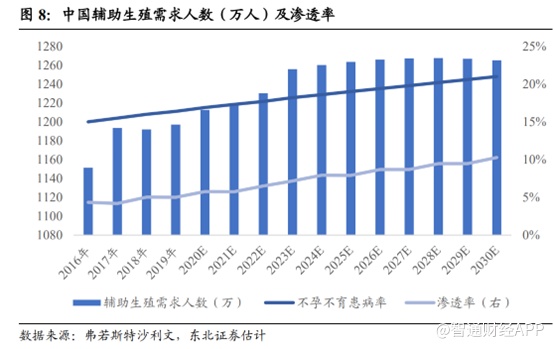 随着不孕症患者的增加,辅助生殖市场规模有望进一步扩大。东北证券预计 2021 年我国不孕夫妇数量约4800 万,而在不孕不育患者中,具有辅助生殖需求患者的比率约为25%,因此2021年有辅助生殖需求的人数达1200万。