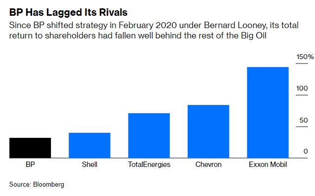 英国石油落后于竞争对手——自鲁尼领导下BP(英国石油)于2020年2月改变战略以来,其股东总回报率远远落后于其他大型石油公司