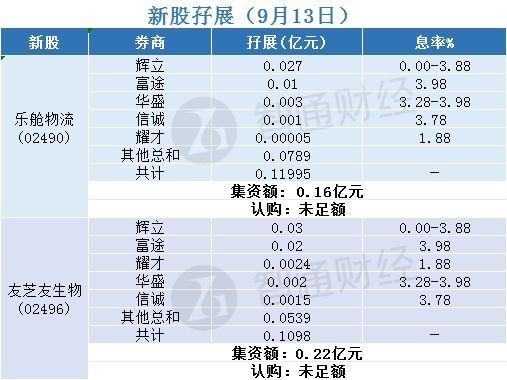 智通财经APP获悉,乐舱物流(02490)、友芝友生物(02496)正在招股中。截至9月13日,辉立、富途等合计为乐舱物流借出孖展0.11995亿港元,认购未足额;合计为友芝友生物借出孖展0.22亿港元,认购未足额。