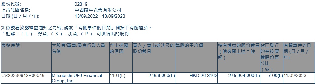 智通财经APP获悉,香港联交所最新资料显示,9月11日,Mitsubishi UFJ Financial Group, Inc.增持蒙牛乳业(02319)295.6万股,每股作价26.8162港元,总金额约为7926.87万港元。增持后最新持股数目约为2.7590亿股,最新持股比例为7.00%。