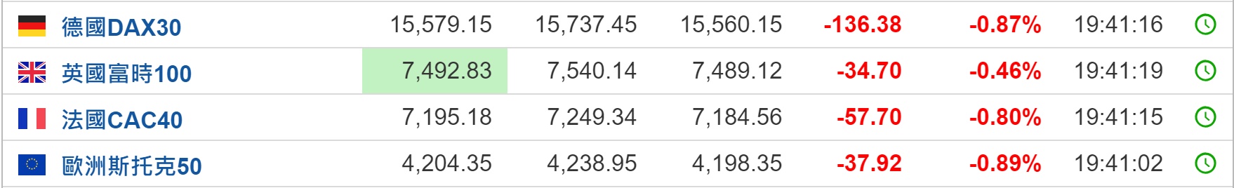 2. 截至发稿,德国DAX指数跌0.87%,英国富时100指数跌0.46%,法国CAC40指数跌0.80%,欧洲斯托克50指数跌0.89%。