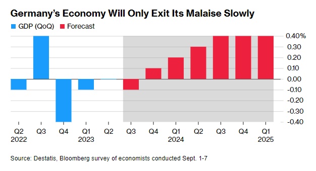 阻碍德国经济增长的因素包括需求疲软、技术工人短缺以及能源危机的持续影响,以及抑制国内需求的顽固通胀。