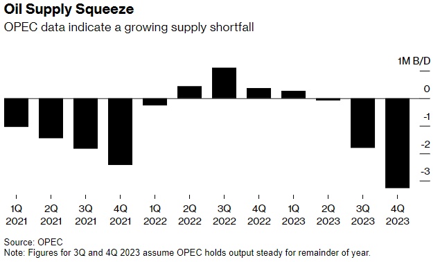 沙特和其他欧佩克+国家经常表示,他们的干预旨在平衡市场,但该组织周二公布的数据显示,未来一个季度的供应缺口将超过300万桶/日,这是至少十年来最大的。欧佩克+联盟对其目前的战略几乎没有给出任何解释。