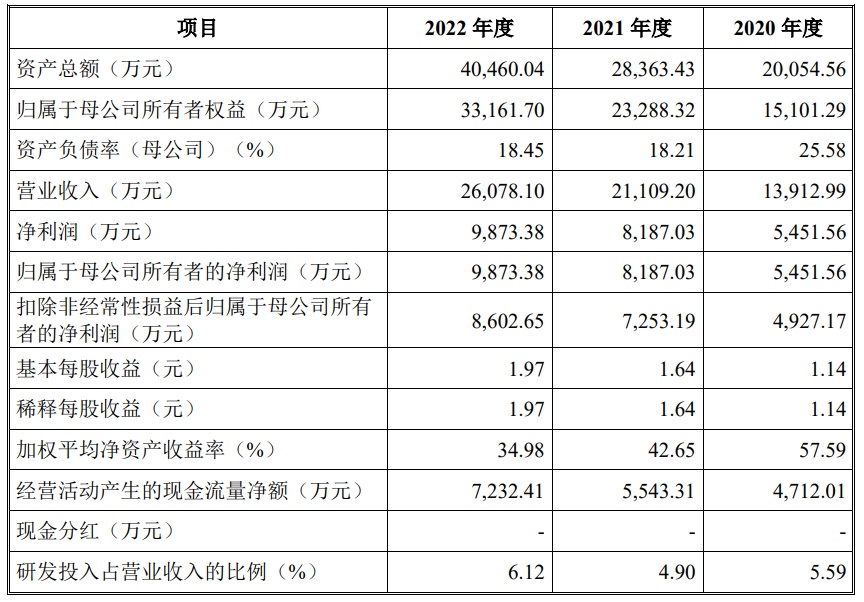 财务方面,于2020年度、2021年度及2022年度,公司实现营业收入分别约为1.39亿元、2.11亿元、2.61亿元。公司净利润分别约为5451.56万元、8187.03万元、9873.38万元人民币。