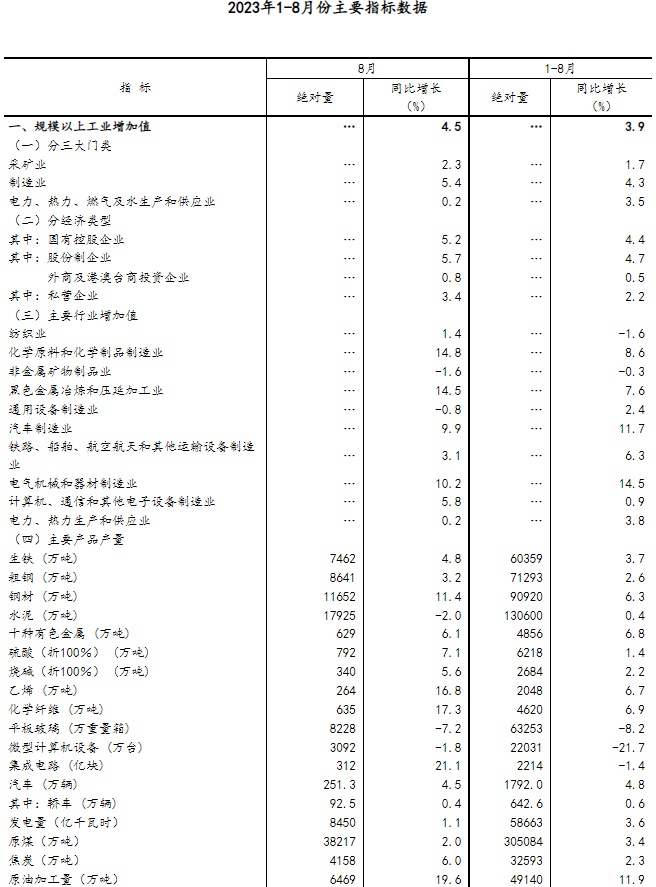 8月份,全国规模以上工业增加值同比增长4.5%,比上月加快0.8个百分点;环比增长0.50%。分三大门类看,采矿业增加值同比增长2.3%,制造业增长5.4%,电力、热力、燃气及水生产和供应业增长0.2%。装备制造业增加值同比增长5.4%,比上月加快2.1个百分点;高技术制造业增加值增长2.9%,加快2.2个百分点。分经济类型看,国有控股企业增加值同比增长5.2%;股份制企业增长5.7%,外商及港澳台商投资企业增长0.8%;私营企业增长3.4%。分产品看,太阳能电池、服务机器人、光电子器件产品产量同比分别增长77.8%、73.7%、29.9%。1-8月份,全国规模以上工业增加值同比增长3.9%。8月份,制造业采购经理指数为49.7%,比上月上升0.4个百分点;企业生产经营活动预期指数为55.6%。