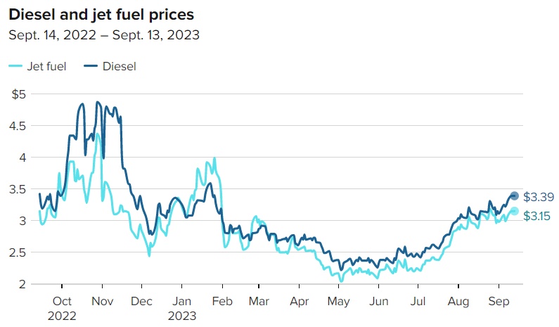 此外,美联航(UAL.US)此前也上调了燃油成本预期,预计2023年的整体燃油价格预计将在每加仑2.95美元至3.05美元之间,此前指引为2.50美元至2.80美元。行业组织美国航空协会的数据显示,截至周二,美国主要机场的航空燃油平均每加仑3.42美元,较两个月前上涨38%。