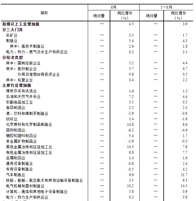 智通财经APP获悉,国家统计局9月15日发布的数据显示,8月份,规模以上工业增加值同比实际增长4.5%(增加值增速均为扣除价格因素的实际增长率)。从环比看,8月份,规模以上工业增加值比上月增长0.50%。1—8月份,规模以上工业增加值同比增长3.9%。