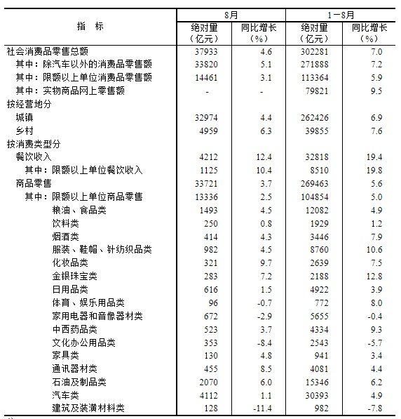 按消费类型分,8月份,商品零售33721亿元,同比增长3.7%;餐饮收入4212亿元,增长12.4%。1—8月份,商品零售269463亿元,同比增长5.6%;餐饮收入32818亿元,增长19.4%。