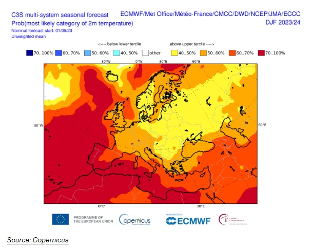 哥白尼气候变化服务项目表示,整个欧洲的冬季可能会比平均水平更温暖、更潮湿。该机构的数据显示,今年12月至明年2月期间,英国、法国、奥地利、意大利和德国部分地区的气温显著高于平均水平的可能性超过50%。伊比利亚半岛出现温和天气的可能性更大。