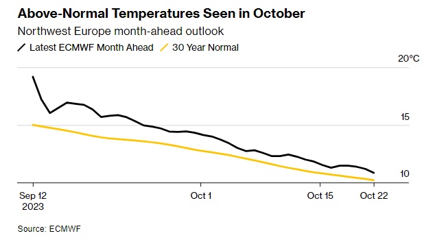 智通财经APP获悉,欧洲联盟气候监测机构哥白尼气候变化服务项目的数据显示,在最近的热浪之后,10月份的气温将高于正常水平,此后的几个月西欧天气也可能继续温和。温和的天气将有助于缓解最近几周世界各地出现的供应风险担忧,与此同时,该地区正准备度过第二个没有大量俄罗斯天然气供应的冬季。