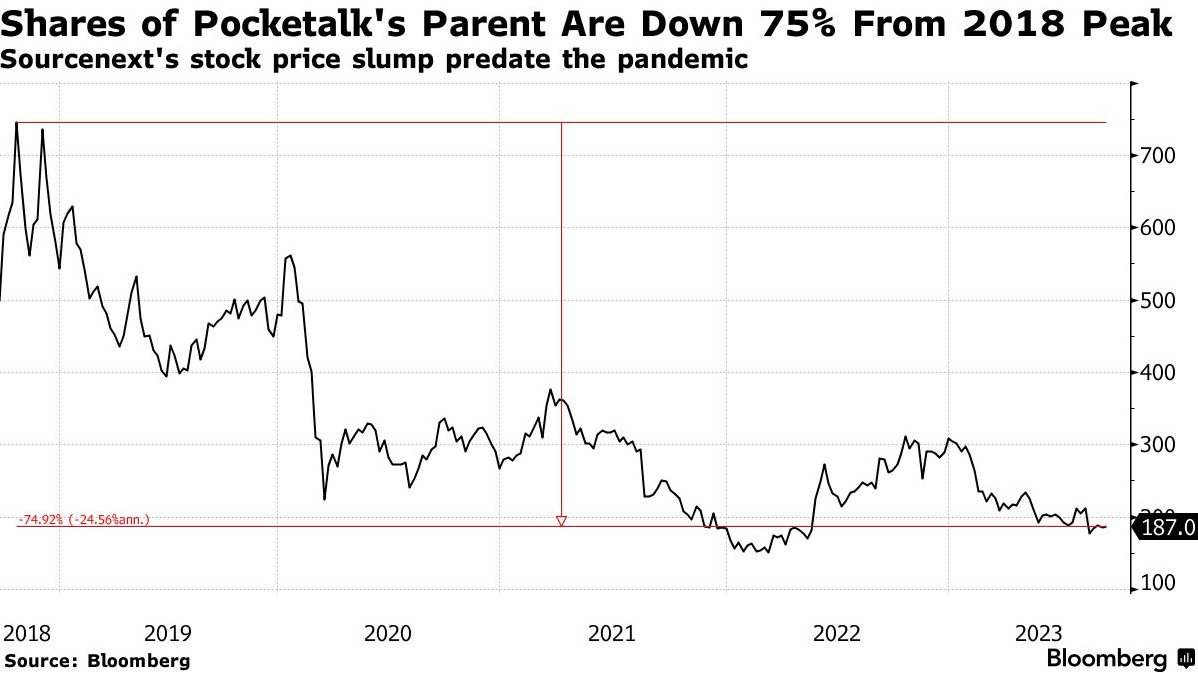由下图可见,尽管疫情后旅游支出激增,但母公司Sourcenext股价未能反弹,较2018年Pocketalk推出信用卡大小的翻译设备后创下的峰值下跌了75%左右。据悉,上个季度,Sourcenext约三分之一的销售额依赖于pockettalk。