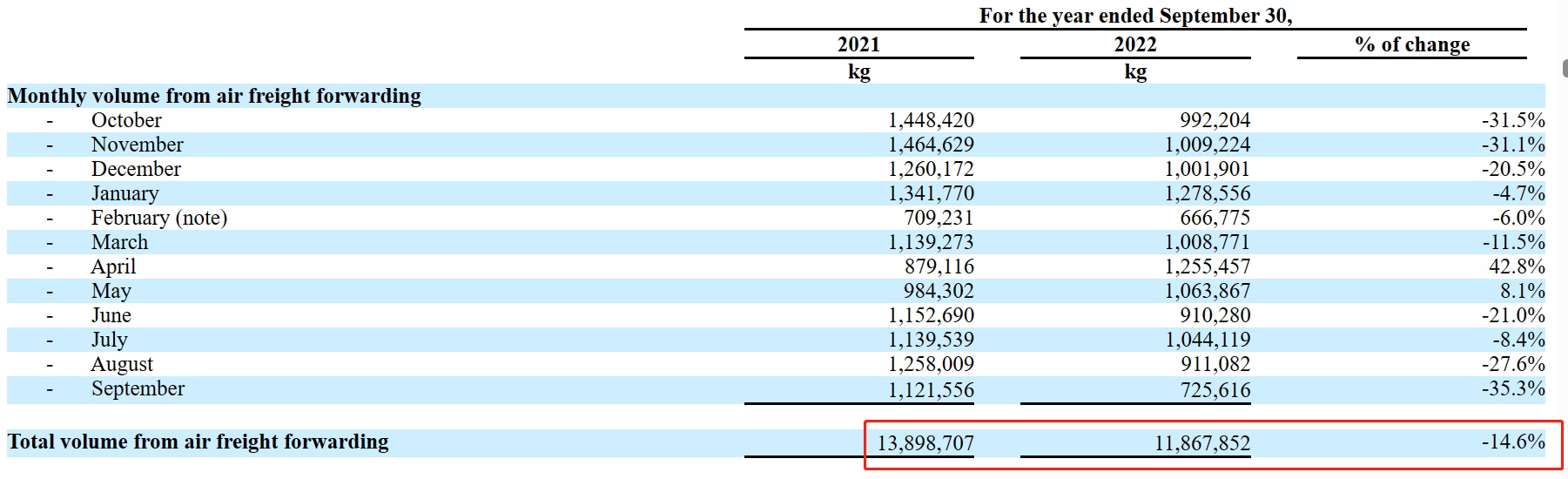 2022财年,新世纪储运取得了收入增长4.92%至7518.61万美元、净利润增长26.16%至698.17万美元的好成绩,这与疫情的影响有直接关系。报告期内,全球市场受疫情影响导致需求端有所回落,新世纪储运在2022财年的空运货运量也出现了14.6%的下滑。