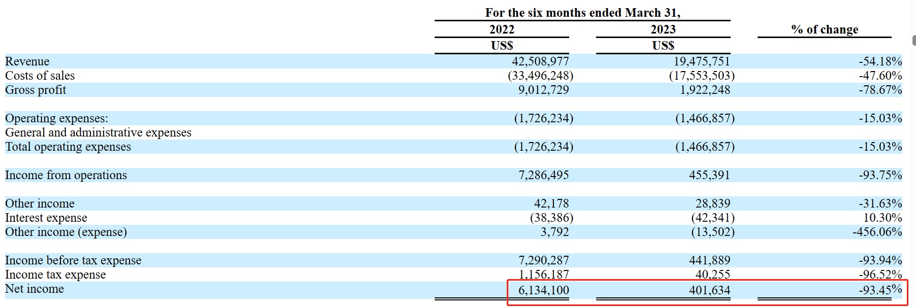 从利润表来看,新世纪储运的业绩波动较大,公司2021、2022财年(截至9月30日止12个月)的收入分别为7165.95万、7518.61万美元,同期的净利润分别为553.39万、698.17万美元,呈增长态势。但至2023财年上半年(截至3月30日止6个月)时,公司的收入为1947.58万美元,同比大跌54.18%,净利润为40.16万美元,同比大跌93.45%。