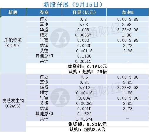 智通财经APP获悉,乐舱物流(02490)、友芝友生物(02496)正在招股中。截至9月15日,辉立、富途等券商合计为乐舱物流借出孖展0.36515亿港元,超购1.28倍;合计为友芝友生物借出孖展1.01674亿港元,超购3.6倍。