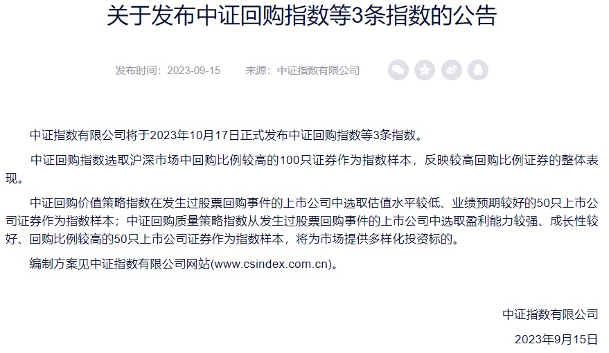 智通财经APP获悉,9月15日,中证指数发布公告称,中证指数有限公司将于2023年10月17日正式发布中证回购指数等3条指数。其中,中证回购指数选取沪深市场中回购比例较高的100只证券作为指数样本,反映较高回购比例证券的整体表现。
