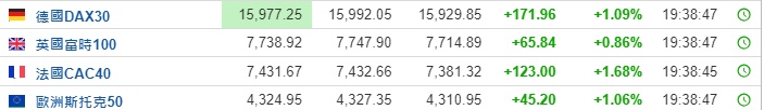 2. 截至发稿,德国DAX指数涨1.09%,英国富时100指数涨0.86%,法国CAC40指数涨1.68%,欧洲斯托克50指数涨1.06%。