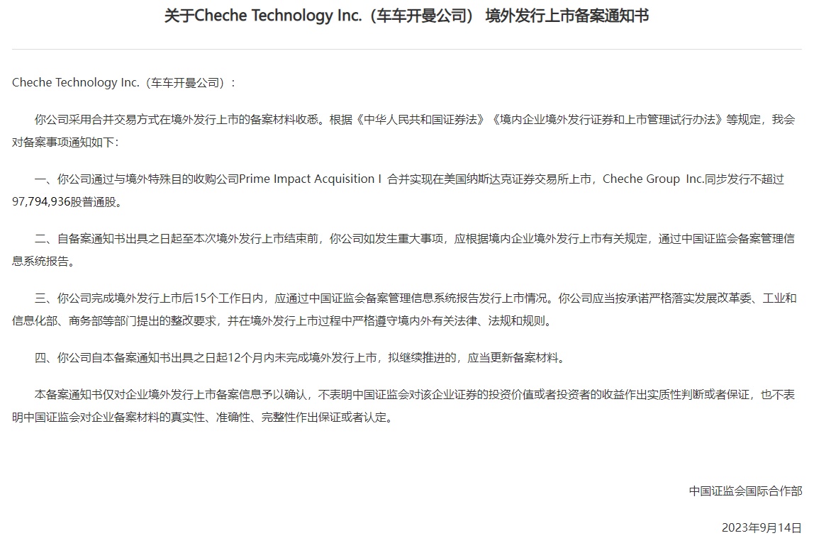 Inc.(车车开曼公司)境外发行上市备案通知书,该公司通过与境外特殊目的收购公司Prime Impact Acquisition