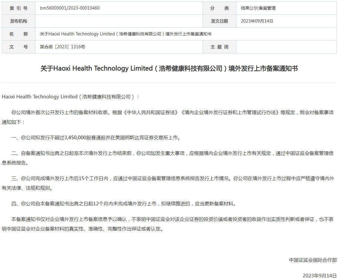 智通财经APP获悉,9月14日,中国证监会发布关于Haoxi Health Technology Limited(浩希健康科技有限公司)境外发行上市备案通知书。通知书显示,浩希健康拟发行不超过3,450,000股普通股并在美国纳斯达克证券交易所上市。