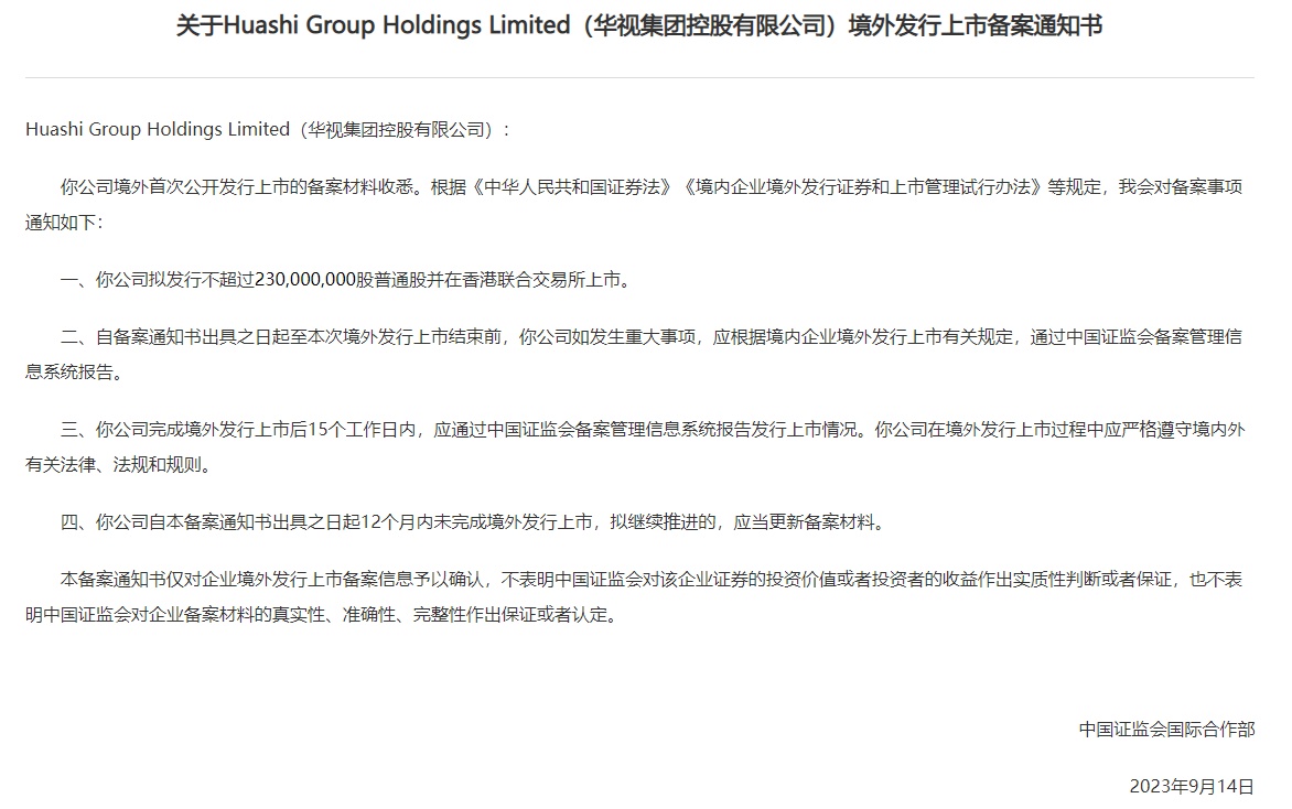 Limited(华视集团控股有限公司)境外发行上市备案通知书,该公司拟发行不超过2.3亿股普通股并在香港联合交易所上市。