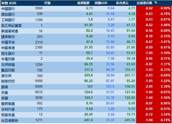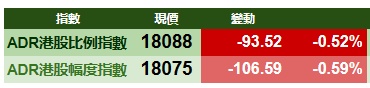 智通财经APP获悉,周五美股三大指数齐跌,港股ADR指数下跌,按比例计算,收报18088点,较香港收市跌93.52点或0.52%。