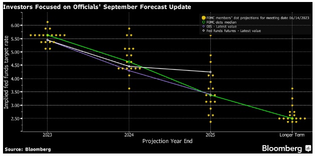 点阵图的两个关键问题是,政策制定者是否仍预期年底前再加息25个基点,以及他们预计2024年的宽松程度是多少。今年6月,美联储政策制定者曾预计在2024年将降息1个百分点。