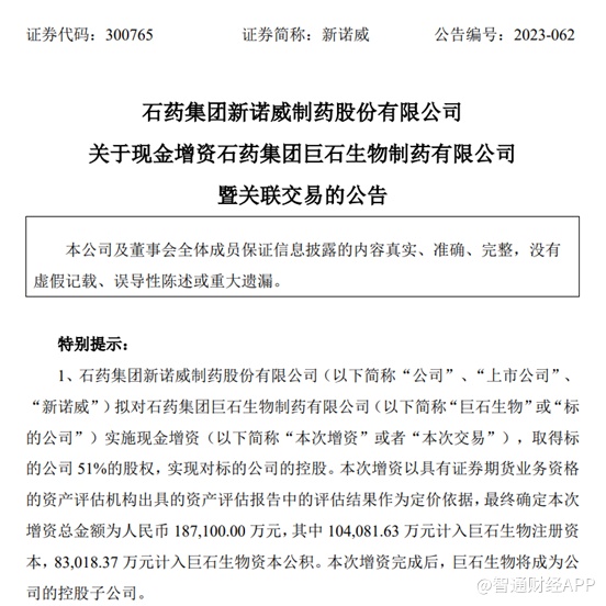 值得一提的是,从具体的交易细节来看,此次是新诺威对巨石生物的现金增资,增资总金额为人民币18.71亿元,从而取得巨石生物51%的股权,实现对巨石生物的控股。