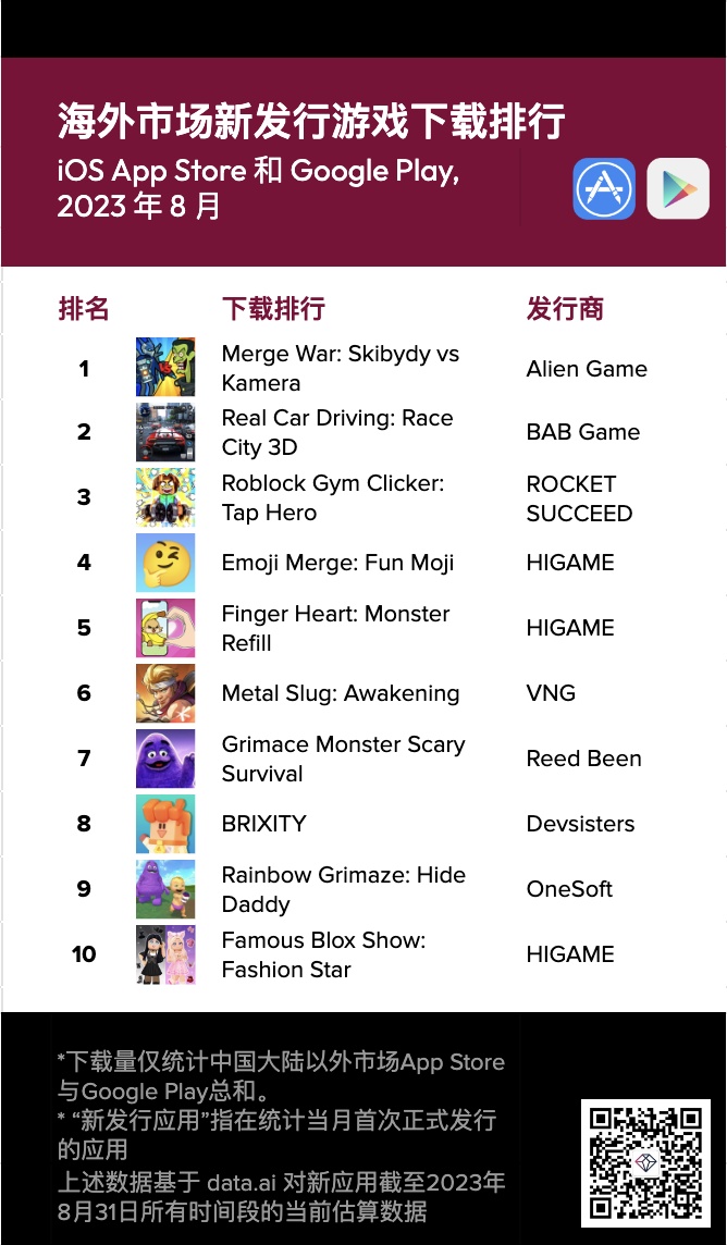智通财经APP获悉,data.ai发布2023 年 8 月海外新应用下载榜,本期共有 16 款新游戏应用,9 款新非游戏应用下载量突破