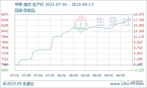 智通财经APP获悉,据生意社商品行情分析系统,近期甲苯价格小幅上涨。9月17日甲苯基准价在8340元/吨,9月11日基准价在8240元/吨,周期内涨幅1.21%。