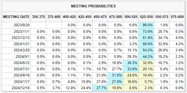 根据CME的FedWatch工具,交易员认为周三美联储维持利率不变的概率高达99.0%,11月维持利率不变的概率为73.0%,12月维持利率不变的概率为61.4%。