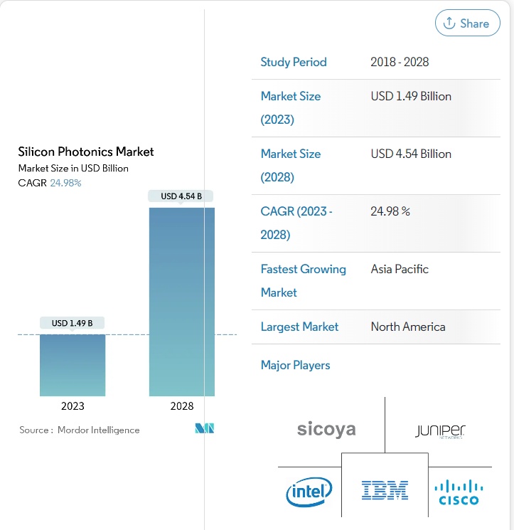 知名研究机构Mordor Intelligence预测数据则较为保守,2023年硅光子市场规模预计为14.9亿美元,该机构预计到2028年将达到45.4亿美元,在预测期内(2023-2028年)复合年增长率为24.98%。