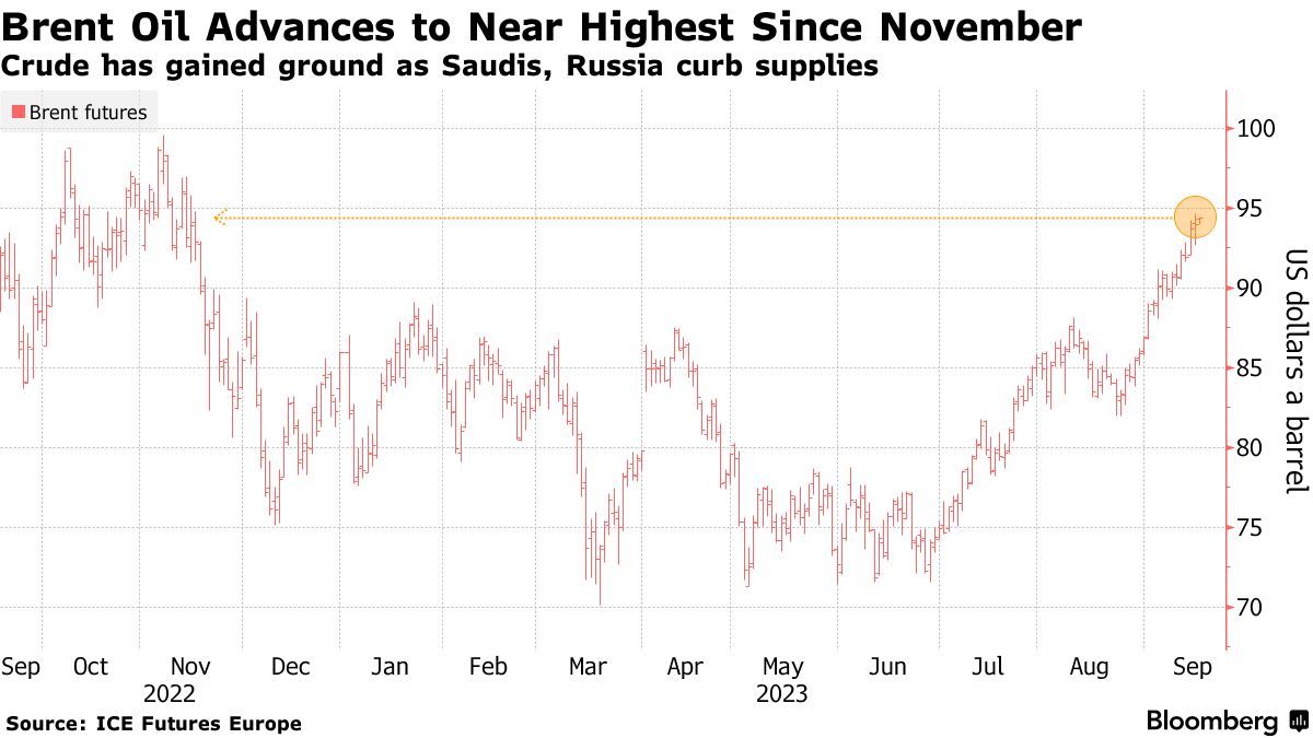 智通财经APP获悉,随着欧佩克+重要成员国沙特与俄罗斯继续额外削减原油供应量收紧市场,国际油价延续上涨势头。此外,沙特阿拉伯能源大臣阿卜杜勒-阿齐兹·本·萨勒曼即将在一次会议上就该国的原油政策和对净零政策的看法发表重要讲话。全球油价基准——布伦特原油(Brent)价格在连续三周上涨(涨幅共计11%)后上涨至每桶94美元上方,逼近95美元大关,接近10个月以来的最高点。