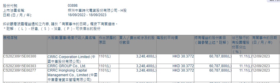 智通财经APP获悉,香港联交所最新资料显示,9月12日,中国中车香港资本管理有限公司增持时代电气(03898)324.84万股,每股作价为30.3772港元,总金额约为9867.73万港元。增持后最新持股数目为6078.78万股,最新持股比例为11.11%。