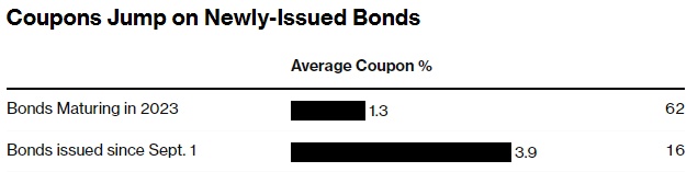 智通财经获悉,在夏季过后的销售热潮中,向欧洲债券市场发售大量投资级债券的企业发现,筹集新融资的成本变得高了许多。数据显示,自本月初以来,16只欧元计价的高评级公司债(不包括金融公司)发售的平均票面利率为3.9%。相比之下,2023年到期的类似高评级公司债券的平均收益率为1.3%。