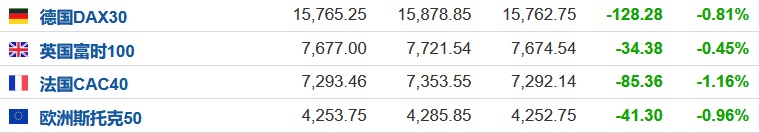 2.截至发稿,德国DAX指数跌0.81%,英国富时100指数涨0.45%,法国CAC40指数跌1.16%,欧洲斯托克50指数跌0.96%。