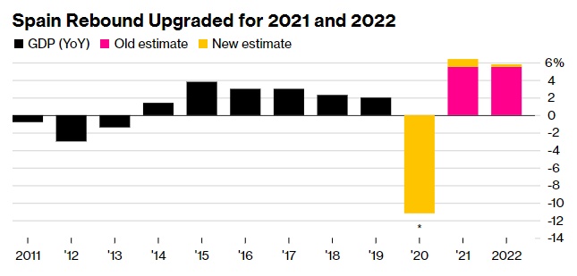 智通财经获悉,西班牙经济从新冠肺炎疫情的冲击中反弹得比最初更强劲。西班牙国家统计局周一公布的修订后数据显示,2021年和2022年的国内生产总值(GDP)分别增长6.4%和5.8%,均远高于最初公布的5.5%。修订后的数据显示,西班牙经济已在2022年而不是2023年年中恢复到疫情前的水平。