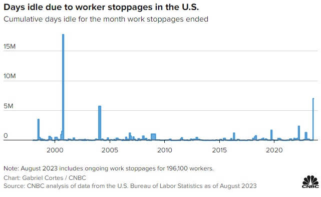 美国劳工部的数据显示,今年仅8月份就损失了约410万工时,是自2000年8月以来损失工时最多的一个月。与7月份相比,20次停工损失了近640万小时。今年到目前为止,已经损失了740万小时,而2022年同期的总损失时间仅为636小时。
