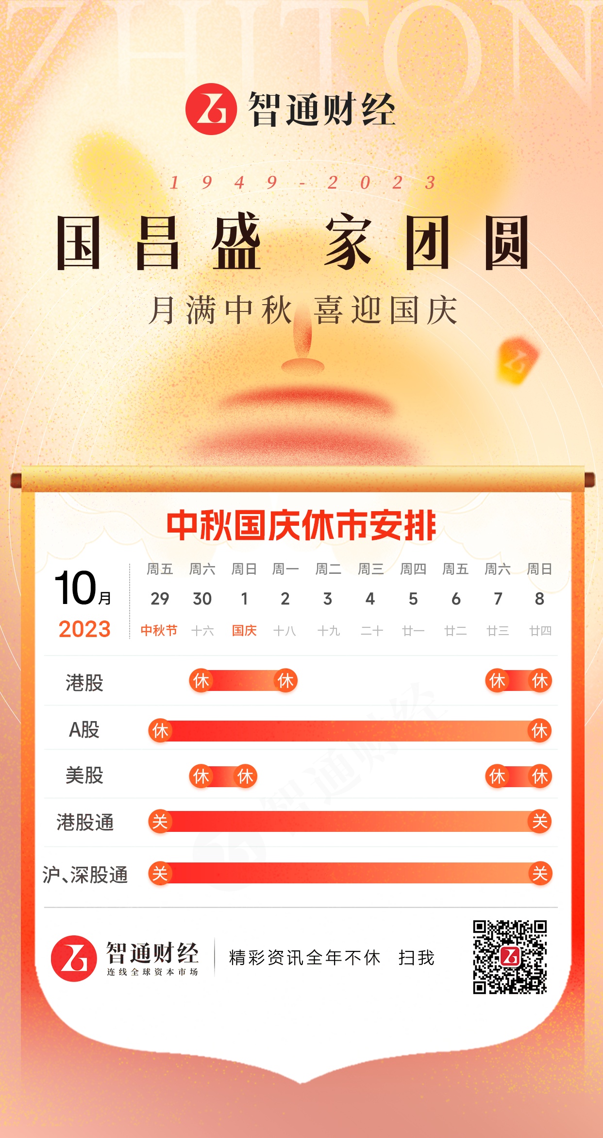 智通财经APP获悉,中秋、国庆节假期来临,港股将于9月30日(周六)到10月2日(周一)期间休市,10月3日(周二)恢复正常交易。