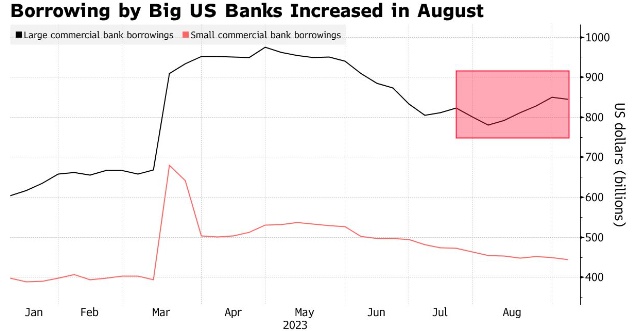 智通财经APP获悉,花旗称,随着美国商业银行借款的增加,同时在储户寻求其它更好的回报的情况下,这表明银行机构开始对准备金的进一步下降感到不安。美联储的数据显示,在经历了6月和7月的下滑之后,美国最大的几家银行8月份的借款增加了9%,即700亿美元。与此同时,为银行提供一般流动性的联邦住房贷款银行系统(FHLB)的未偿债务总额从7月份的1.245万亿美元升至1.249万亿美元。