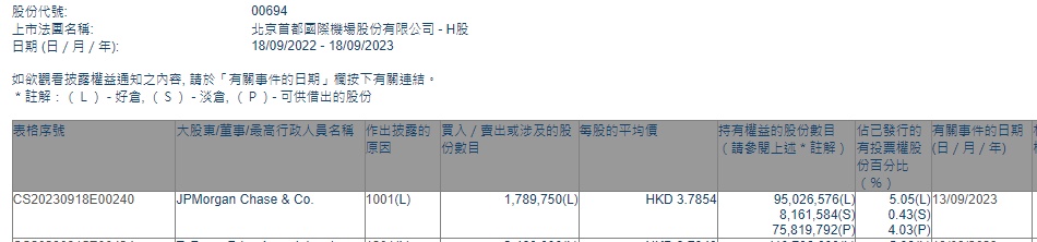 智通财经APP获悉,香港联交所最新资料显示,9月13日,小摩增持北京首都机场(00694)178.975万股,每股作价3.7854港元,总金额约为677.49万港元。增持后最新持股数目约为9502.66万股,最新持股比例为5.05%。