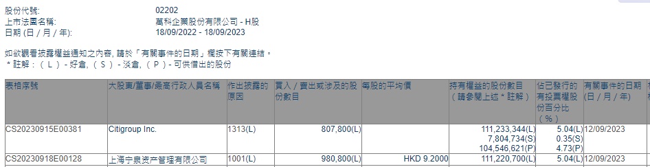 智通财经APP获悉,香港联交所最新资料显示,9月12日,上海宁泉资产管理有限公司增持万科企业(02202)98.08万股,每股作价9.2港元,总金额约902.336万港元。增持后最新持股数目约为1.11亿股,最新持股比例为5.04%。