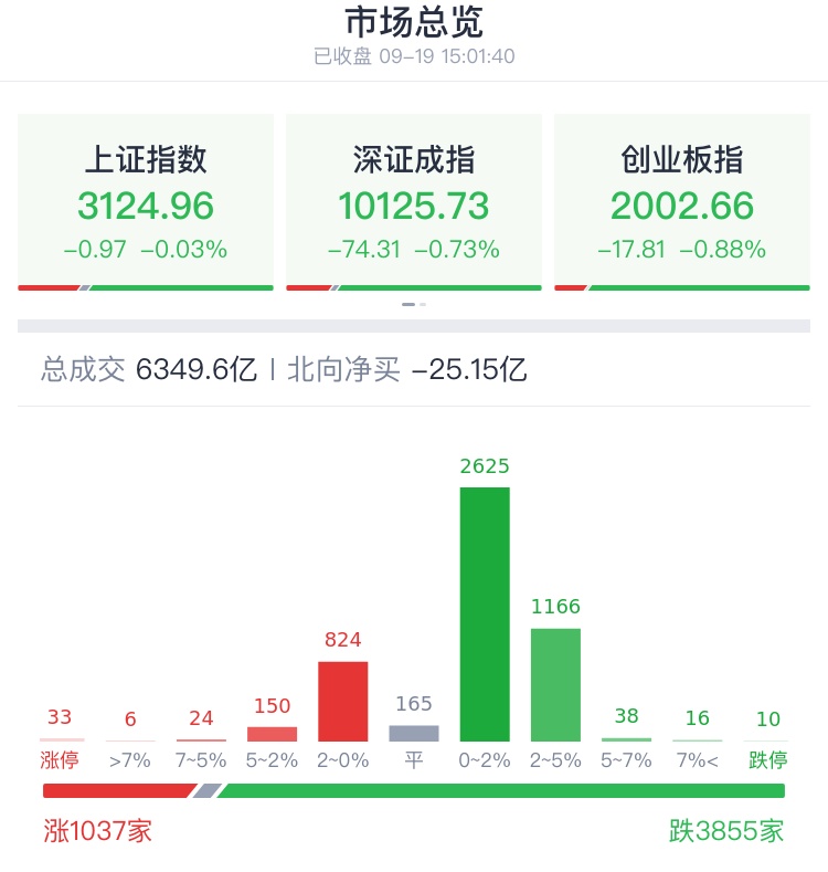 9月19日,A股再度走弱,沪指全天横盘震荡,深成指、创业板指一度跌逾1%,截至收盘,上证指数跌0.03%,深证成指跌0.73%,创业板指跌0.88%。