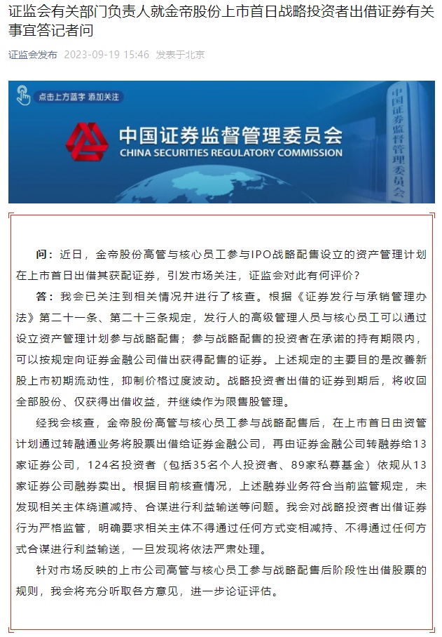 智通财经APP获悉,近日,金帝股份(603270.SH)高管与核心员工参与IPO战略配售设立的资产管理计划在上市首日出借其获配证券,引发市场关注。对此,今日证监会回应称,经证监会核查,金帝股份高管与核心员工参与战略配售后,在上市首日由资管计划通过转融通业务将股票出借给证券金融公司,再由证券金融公司转融券给13家证券公司,124名投资者(包括35名个人投资者、89家私募基金)依规从13家证券公司融券卖出。根据目前核查情况,上述融券业务符合当前监管规定,未发现相关主体绕道减持、合谋进行利益输送等问题。