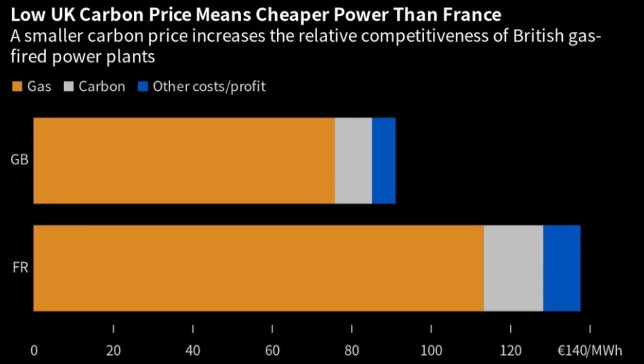 作为市场改革的一部分,英国政府最近决定减轻排放企业的负担,带来了价格优势。由于碳排放许可证供应过剩,英国今年碳排放价格下跌了50%,相比之下,欧盟的相关期货价格下跌了不到3%。这意味着英国的电站群相对于欧洲大陆的电站群具有竞争优势。