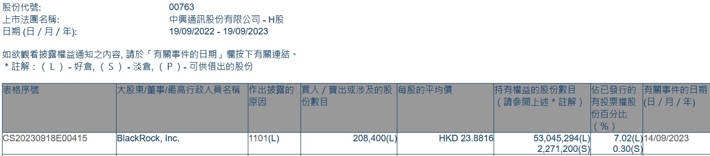 智通财经APP获悉,香港联交所最新资料显示,9月14日,贝莱德增持中兴通讯(00763)20.84万股,每股作价23.8816港元,总金额约为497.69万港元。增持后最新持股数目约为5304.53万股,最新持股比例为7.02%。