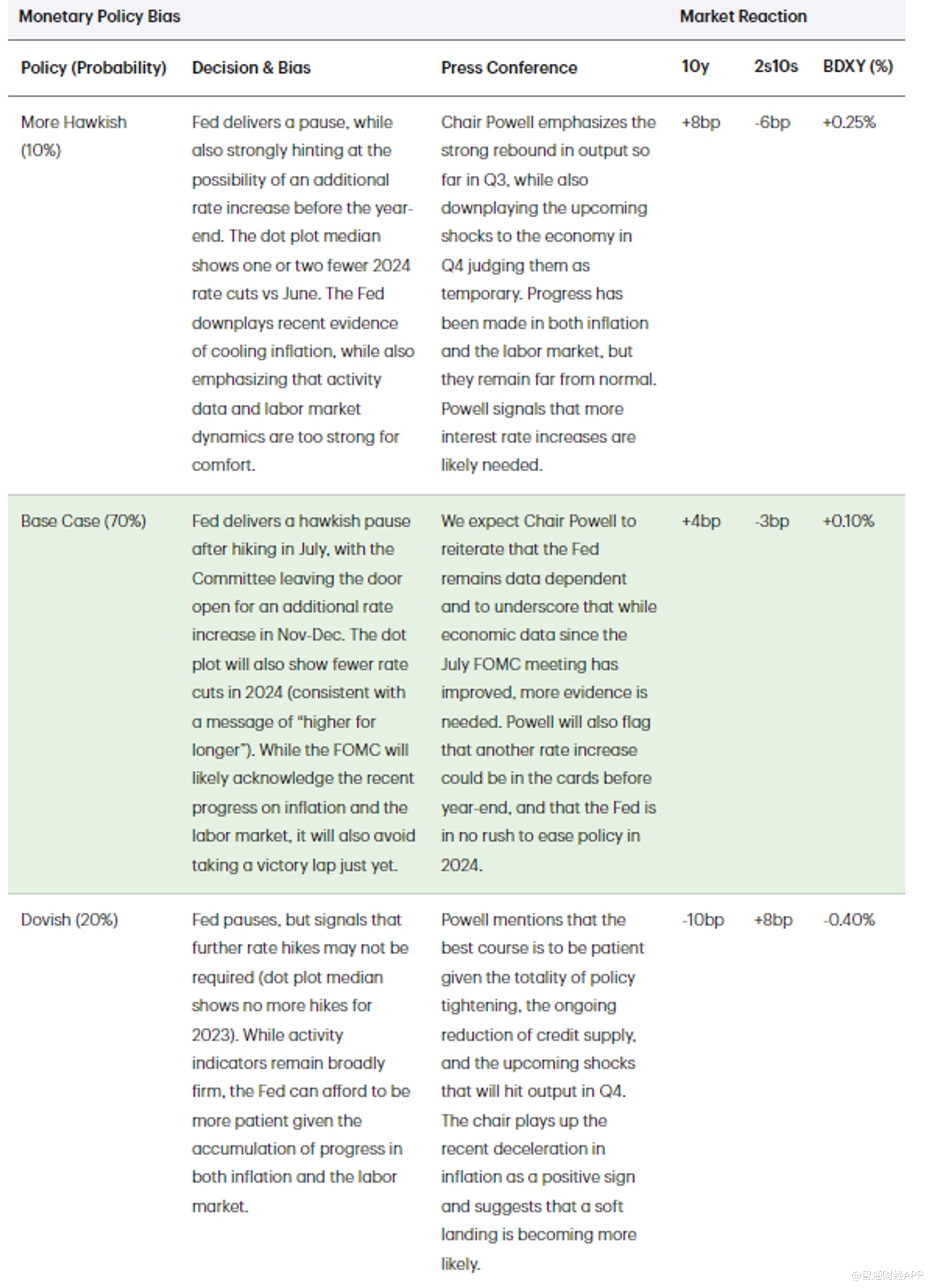 道明策略师看到他们的基本预期实现的可能性为70%,相对于周二早上的水平,他们表示这应该导致10年期美债收益率大约上升4个基点,2年期和10年期利率之间的利差略为负,而彭博美元现货指数将上升0.1%。