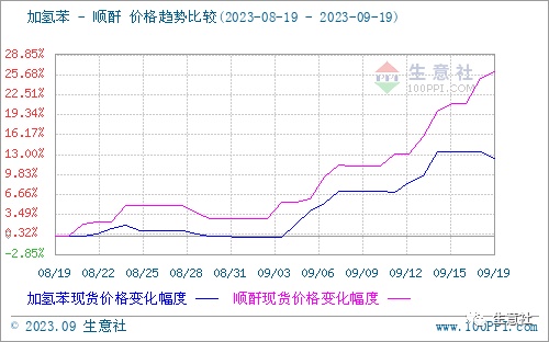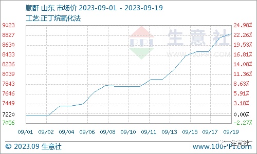 智通财经APP获悉,据生意社商品行情分析系统,进入9月份国内顺酐市场行情持续上涨,截至9月19日正丁烷氧化法顺酐市场均价保持在8859.80元/吨,较9月1日价格7220元/吨上涨22.71%。截止19日山东地区固酐8800元/吨左右,江苏地区固酐8800元/吨左右,华南地区固酐9100元/吨左右。