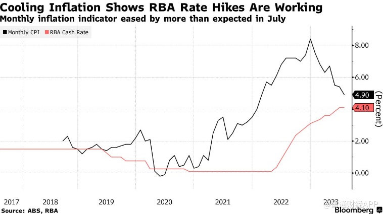 澳大利亚的月度价格数据显示,通胀稳步放缓,从2022年12月8.4%的峰值降至7月份的4.9%。鉴于季度数据的范围更广,下个月的报告可能是关键,澳洲联储也将更新其对11月政策会议的预测。